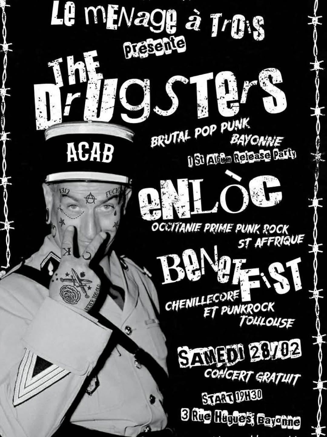 Le Ménage à Trois à Bayonne accueille un triple plateau punk et rock explosif avec The Drugsters, Enlòc et Benefist pour clôturer le mois de février en beauté. Trois groupes, trois énergies, une soirée de concerts gratuits au coeur de la capitale du Pays Basque nord.