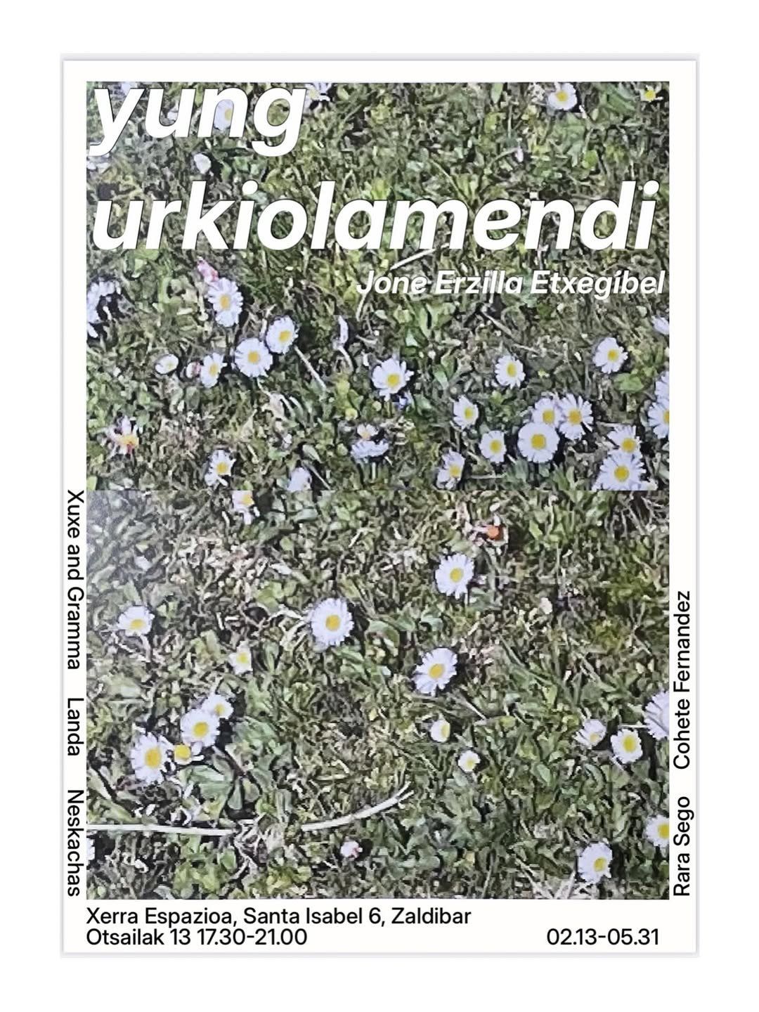 Inauguration de l'exposition Yung Urkiolamendi de Jone Erzilla Etxegibel au Xerra Espazioa (Santa Isabel 6, Zaldibar) le vendredi 13 février 2026. Vernissage festif de 17h30 à 21h avec pintxada par Xuxe & Gramma et Landa, tatoueurs Rara Sego et Cohete Fernandez, et performance de Neskachas. Exposition visible du 13 février au 31 mai 2026.